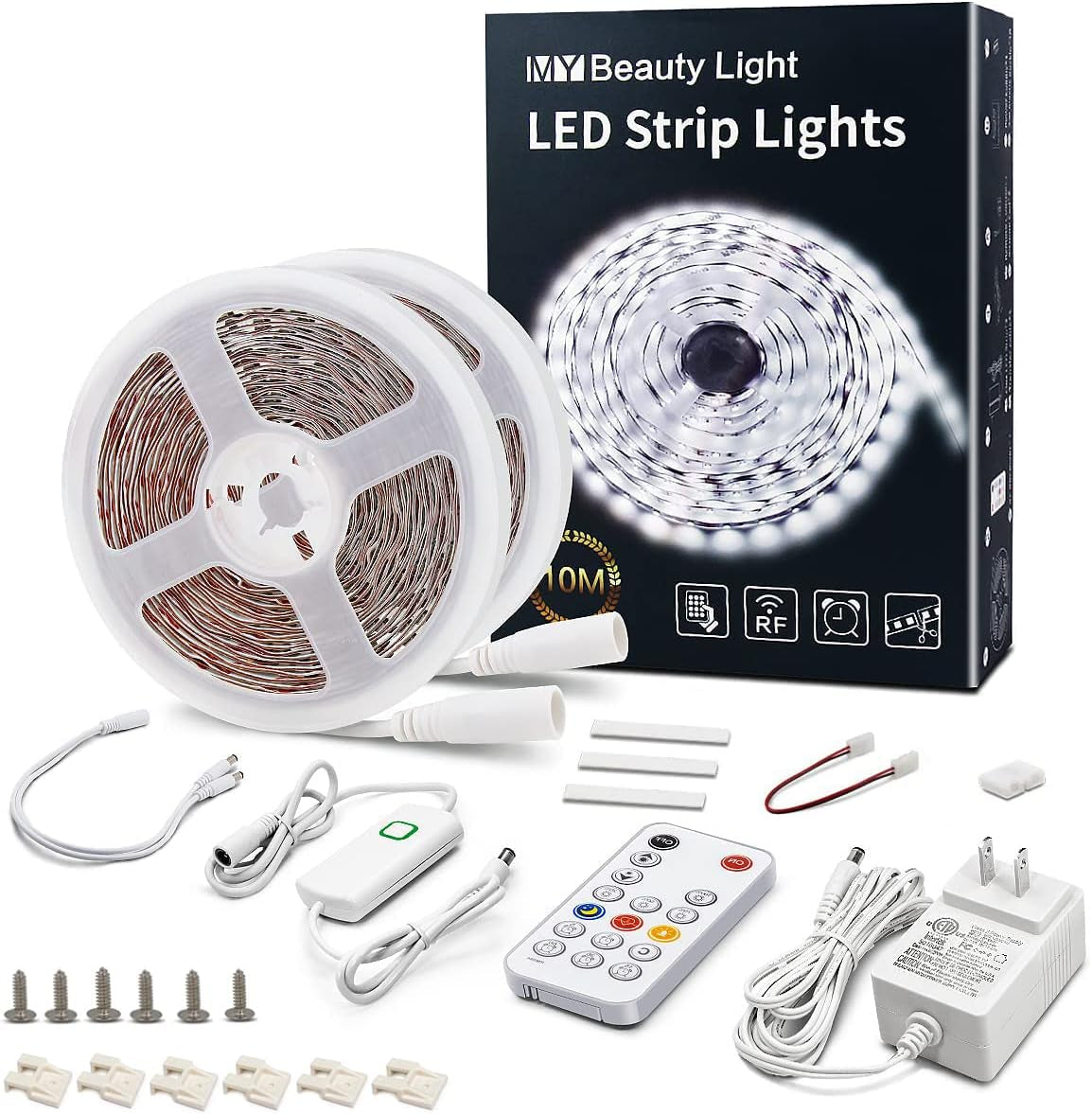LED Strip Lights Warm White,32.8Ft Dimmable LED Light Strip with RF Remote,600 Bright 6500K 2835 Leds,Plug-In Adhesive Rope Lights with Timing Mode for Living Room Bedroom Kitchen -