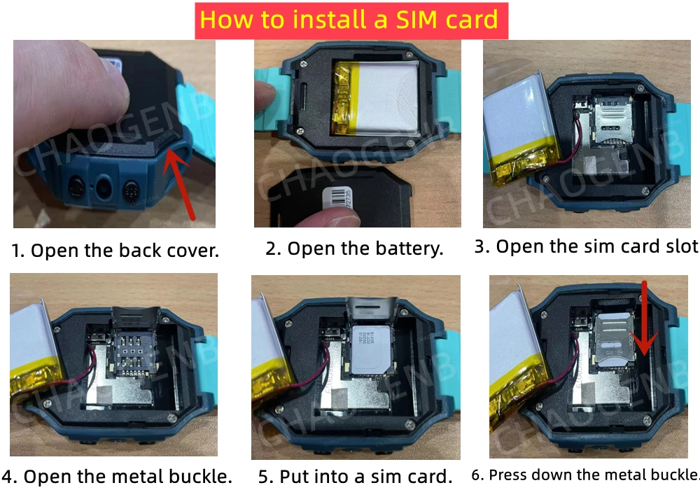 2. Turn off the power when fully charged, Find a gap on the back of the watch, pry off the cover, gently pick up the battery and put it next to it, then open the SIM card slot and After the SIM card is loaded, press and hold the power button to power on. Wait for about one minute after inserting the card, there will be a signal bar in the upper left corner of the watch. After the signal is received normally, the watch will automatically correct the time.